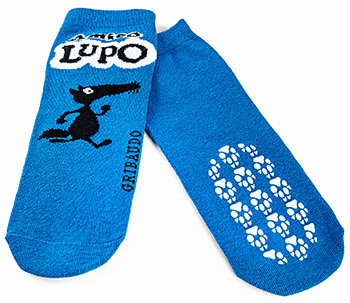 Morbidissimi calzini antiscivolo, in tre vivaci colori, con personalizzazione jacquard e gommini antiscivolo a forma di impronta di Lupo.